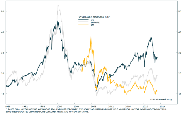 Among the three regions, I tactically favor EM stocks right now based on their higher expected returns, which are a function of what I expect will be faster sales growth and improving profit margins over the next several years. This comes after more than 10 years of stagnant EM earnings growth. I also expect some narrowing of the historically large valuation discount between EM and US indexes.