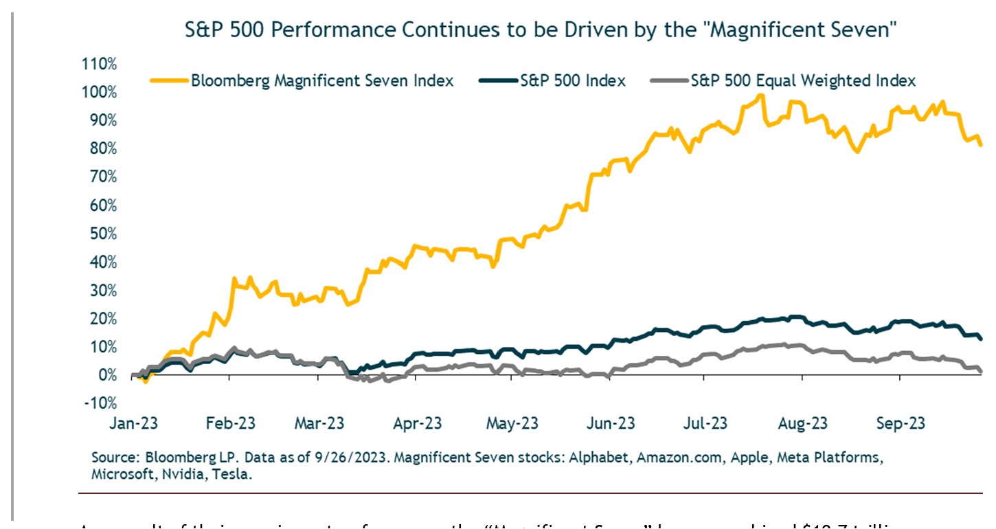 Despite stalling in the latter half of the third quarter, the year-to-date performance of the “Magnificent Seven” stocks continues to explain most of the U.S. stock market’s returns. These seven stocks have increased collectively more than 80% this year, while the remaining 493 stocks in the S&P 500 are basically flat.