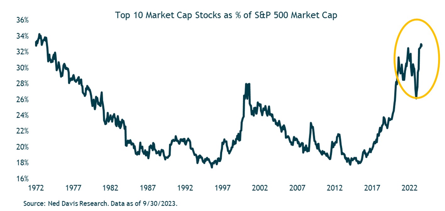 As a result of their massive outperformance, the “Magnificent Seven” have a combined $10.7 trillion market cap and constitute more than 30% of the S&P 500 index. This level of concentration at the top of the U.S. market exceeds what was witnessed in 2021 and the tech bubble of the late 1990’s / early 2000’s. We have to travel all the way back to the early 1970’s (remember the “Nifty Fifty”?) to see a market as concentrated as it is today.