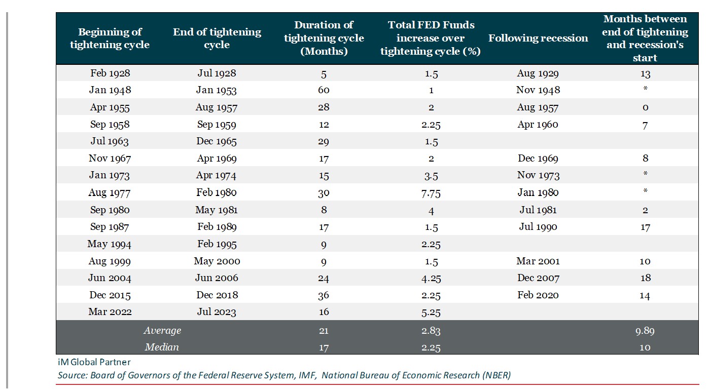 There are reasons to be cautious – my base-case is for a mild recession looking out to 2024. We have seen one of the quickest and sharpest tightening cycles in history, and lending standards have tightened considerably. Both factors create recessionary conditions, particularly as the Fed has a history of raising rates too far, tipping the economy into recession. Since 1931, there have been 19 hiking cycles and in only three instances did the economy avoid a recession (below).