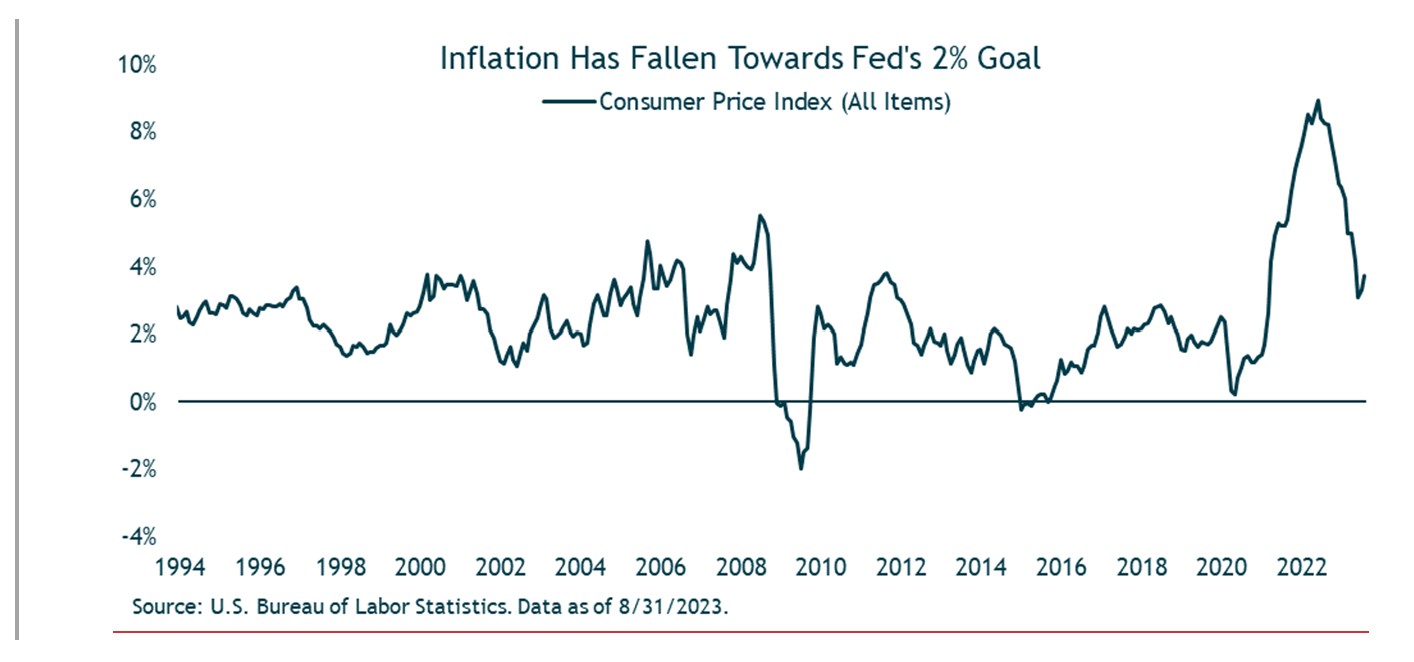 At this point, it is clear the rate-hike regime is close to an end and I believe the Fed has gotten the upper hand on inflation. The aggressive hiking cycle that started roughly 18 months ago was finally put on pause in late-July—although one more 25 basis point hike could still happen. Since March 2022, the Federal Reserve increased rates from zero to a target level of 5.25%-5.5%.