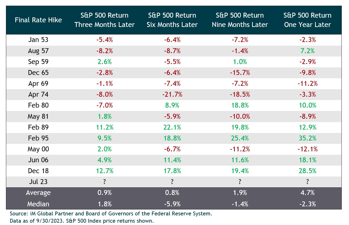 Historically, stock market returns over the next six to 12 months following a pause in a tightening cycle are mixed depending on the inflation environment. As we can see in the following chart, most of the negative outcomes occur during bouts of higher inflation when the Fed will typically maintain a more restrictive policy, i.e., it will take them longer to pivot and cut rates (i.e., pre-1980’s). On the other hand, when inflation is not elevated, the Fed can move to a more accommodative stance much sooner, leading to better equity market outcomes (i.e., post-1980’s).