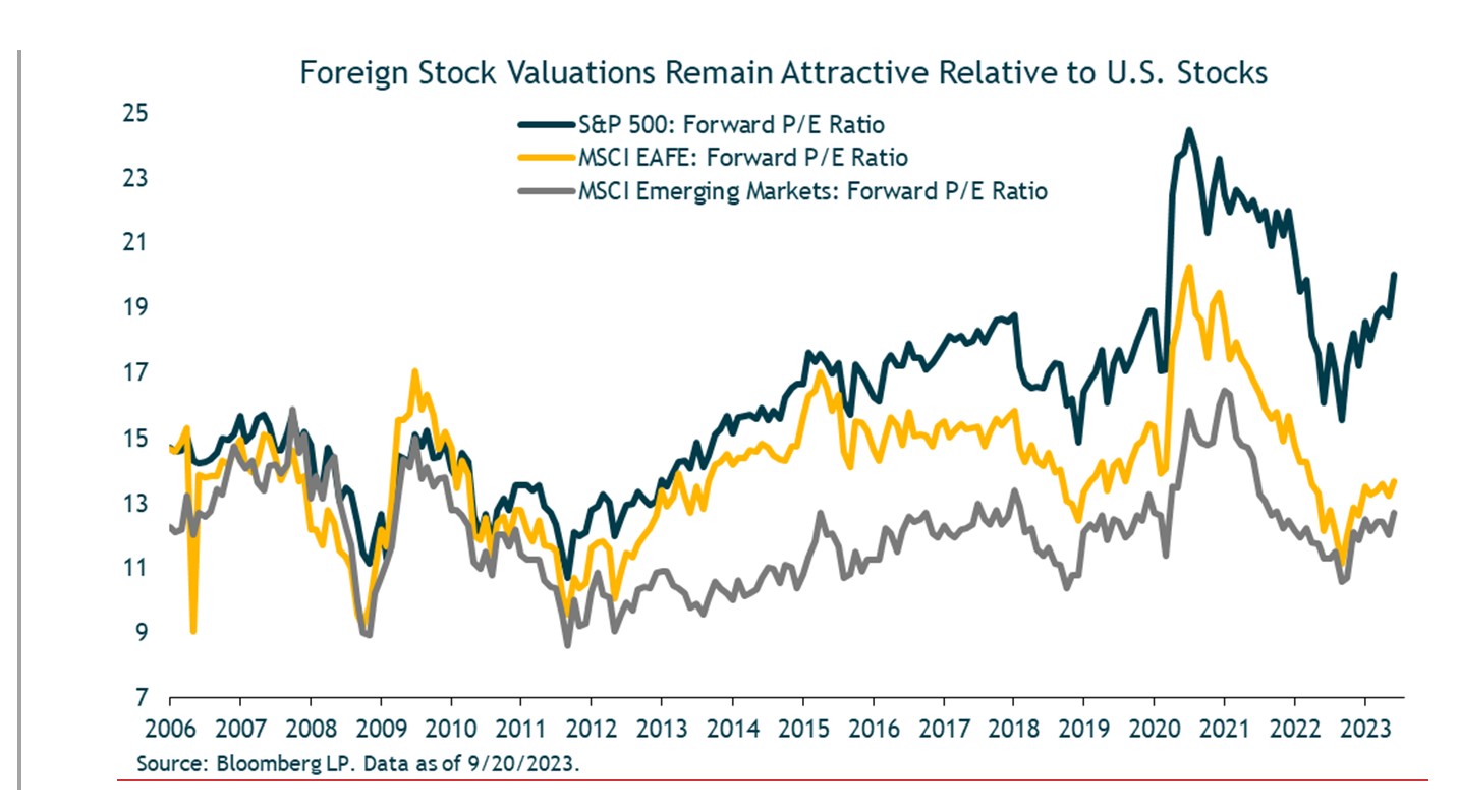 In bond markets, the 10-year Treasury yield climbed nearly 70bps in the quarter, ending the period at 4.59% – the highest point since before the financial crisis in 2008. As a result, core bonds (Bloomberg U.S. Aggregate Bond Index) fell sharply, declining 3.2% over the quarter. High-yield bonds (ICE BofA US High Yield) managed to eke out a small quarterly gain and are up 6% year-to-date.