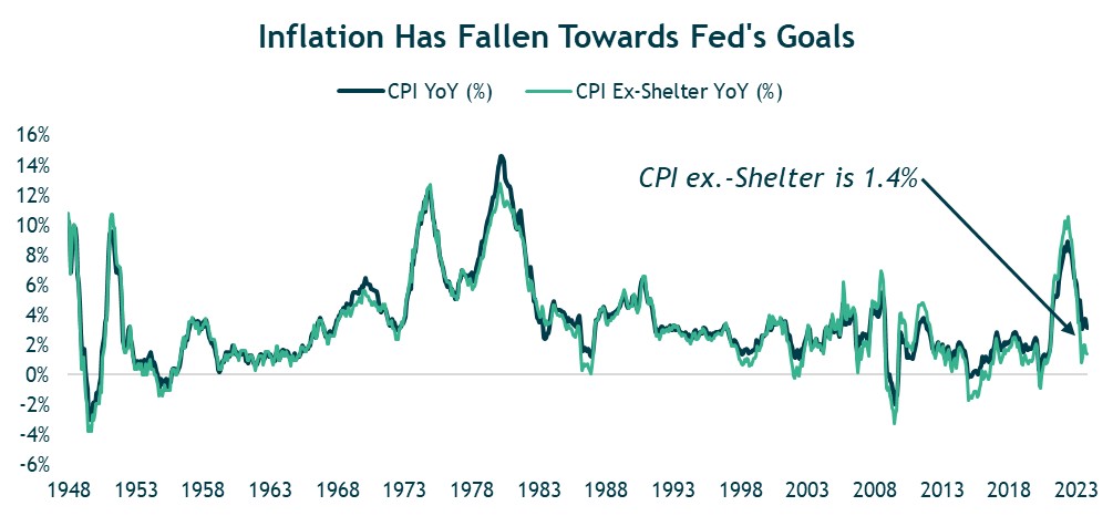 The chart below illustrates the year-over-year inflation rate and year-over-year inflation rate excluding shelter costs, which is a key CPI input. (It makes up about 30% of the CPI.) While year-over-year inflation recently came in at 3.1%, this number drops to 1.4% when excluding shelter. These levels are near the Fed’s goals, which suggests that the Fed’s policy has been working, and with time inflation could continue to fall, particularly if shelter continues to decline.