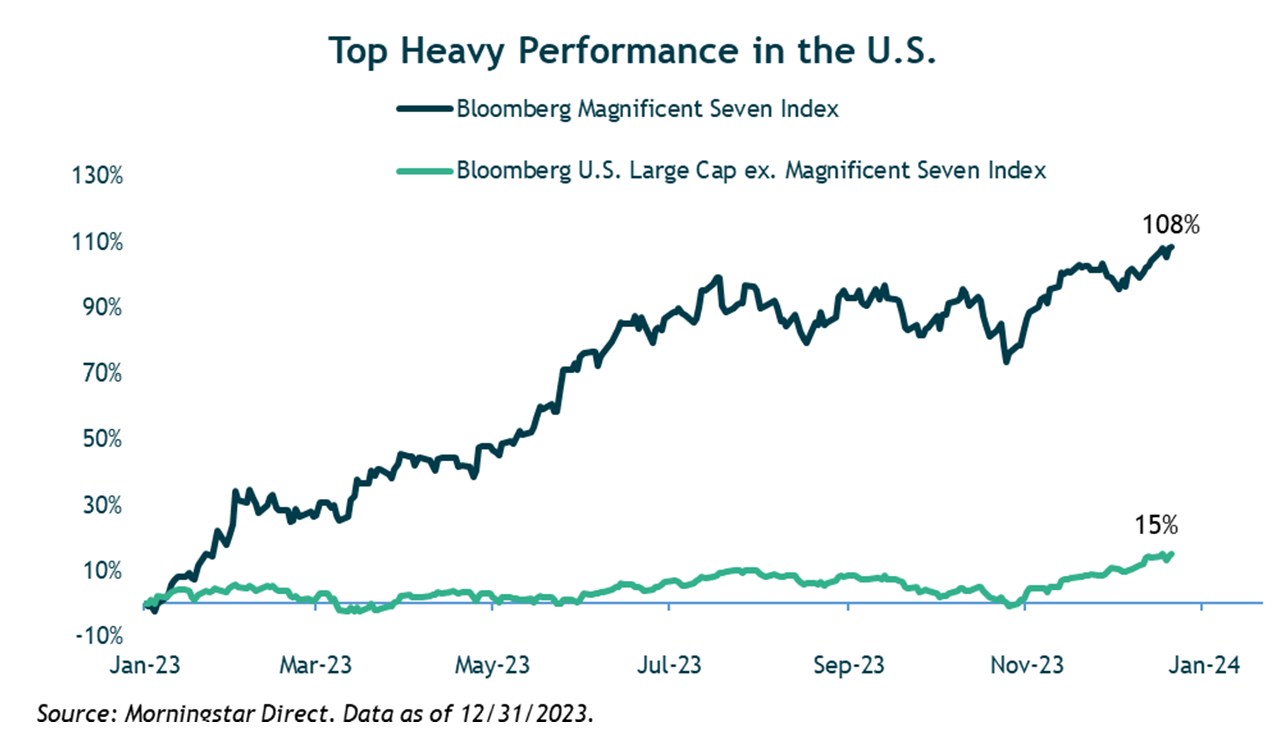 Within the U.S. stock market, performance in 2023 was driven by the handful of mega-cap growth stocks, dubbed the “Magnificent 7” (Apple, Microsoft, Nvidia, Facebook, Alphabet, Netflix, Amazon). These stocks had an average return in excess of 100% for 2023 and now represent a combined weight of more than 28% in the S&P 500 and 47% in the Russell 1000 Growth Index – near historic highs. However, much of the return in these stocks were driven by expanding valuation multiples leaving them expensive relative to the broader market.