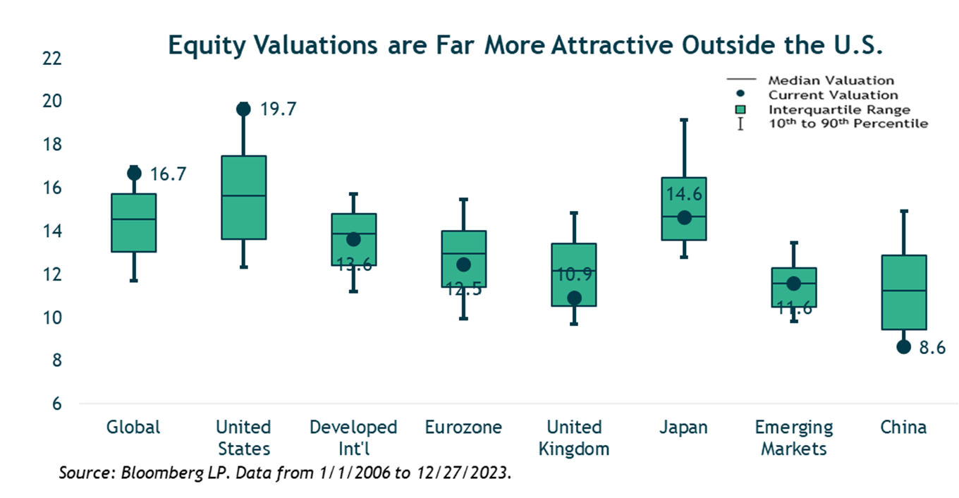 My overall equity allocation continues to favor another unloved segment of the market – foreign stocks. Heading into 2024, the valuation discount for developed international and emerging-market stocks versus the U.S. is the widest it’s been in decades. From 2006 through 2016, the U.S. and developed markets traded within one multiple point of each other. The average forward P/E for the S&P 500 over the period was 14x compared to 13x for MSCI EAFE. Since 2016, the valuation gap has widened substantially. The S&P 500 now trades at nearly 20x forward earnings while the MSCI EAFE remains close to 13x. The story can be seen in the chart below—U.S. stocks trade toward the top end of their valuation range while other regions offer up better relative values. Most other markets are trading roughly in-line or slightly below their historic averages. All else equal, lower starting valuations imply better long-term expected returns and provide more of a valuation cushion should multiples contract in a stock market sell-off.
