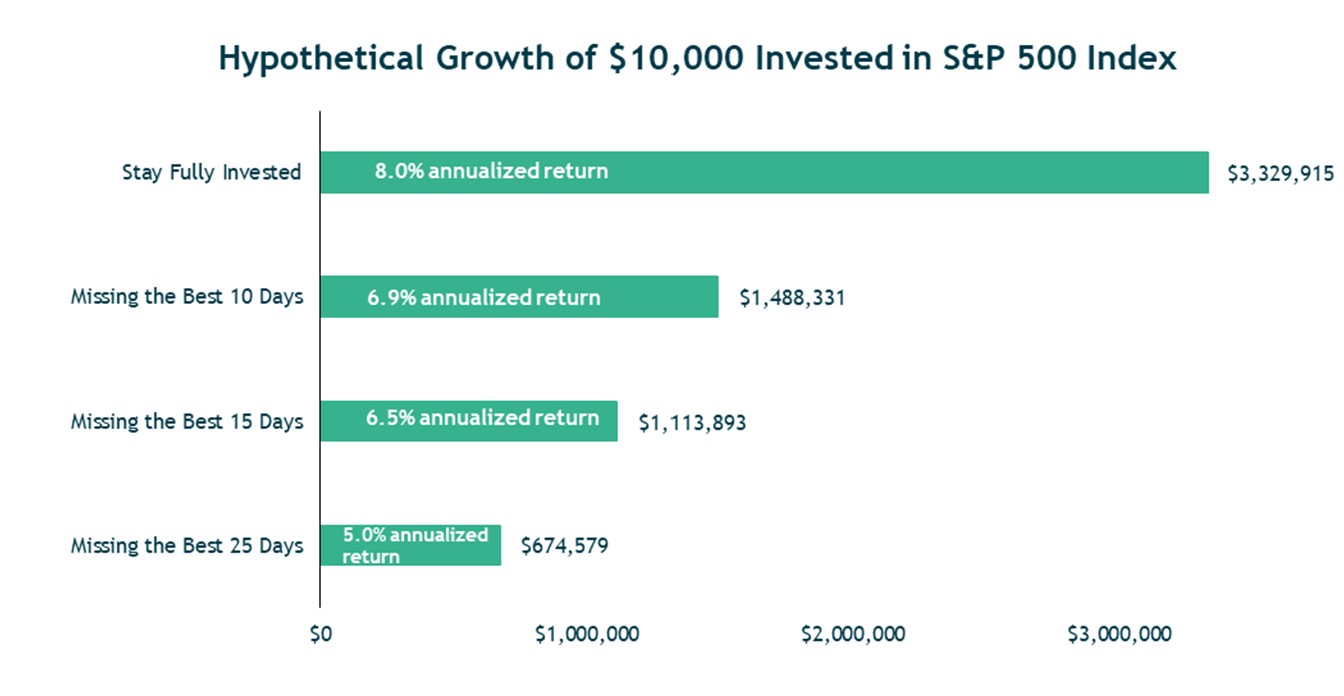 During periods of heightened volatility, I find it valuable not to overreact to the latest headline that could tempt investors to sell their equity exposure. Historically, stock market corrections recover within a few months, and investors who stay the course often benefit as markets rebound. As illustrated in the chart below, panic selling during risk-off markets can be a significant drag on long-term returns – as the old saying goes, “time in the market is more important than timing the market.”
