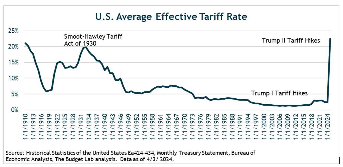 President Trump further shocked investors on April 2 (what he declared “Liberation Day”) by announcing a comprehensive set of much higher-than-expected tariffs. These included a 10% baseline tariff on all imports and unexpected and significantly higher tariffs for certain trade partners, such as 54% for China and 20% for the European Union. These tariffs in aggregate, if implemented and maintained, would result in the effective tariff rate on all imports rising to 24%, putting it at a 125-year high.