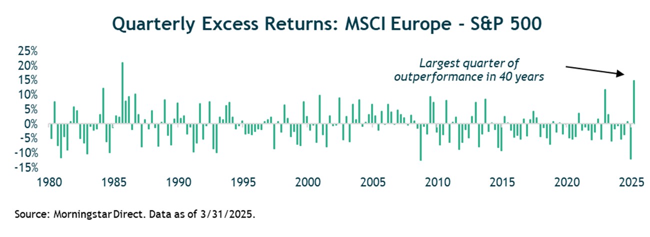 However, while I am seeing headwinds in the U.S., I am getting some good news in other parts of the world. European stocks have been a bright spot this year, significantly outperforming U.S. stocks – their widest quarterly outperformance gap versus U.S. stocks in 40 years (see chart below). Fiscal stimulus, particularly from Europe’s largest economies in Germany and France, increased defence spending, and accommodative monetary policy could stimulate economic activity and bolster equity markets.